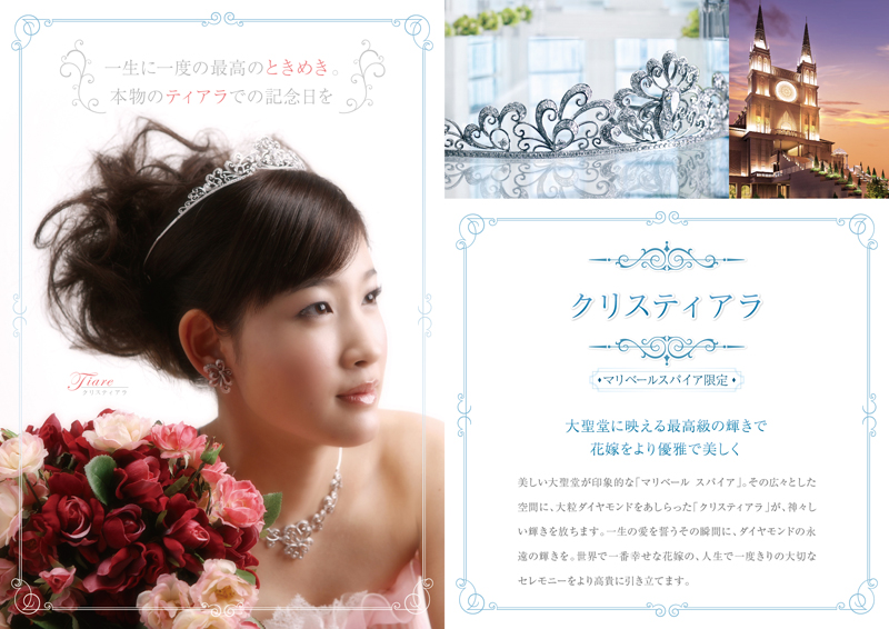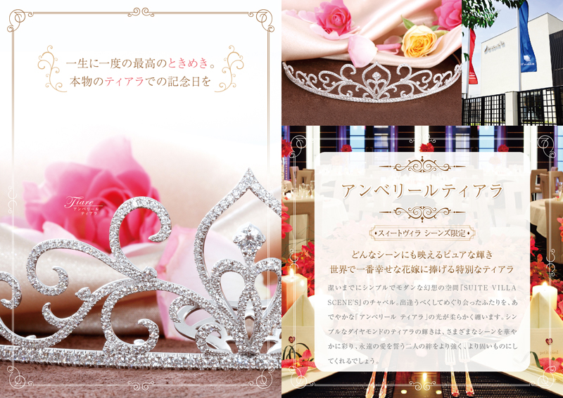 潔いまでにシンプルでモダンな幻想の空間『SUITE VILLA SCENE'S』のチャペル。出逢うべくしてめぐり会ったふたりを、あでやかな「アンベリール ティアラ」の光が柔らかく纏います。シンプルなダイヤモンドのティアラの輝きは、さまざまなシーンを華やかに彩り、永遠の愛を誓う二人の絆をより強く、より固いものにしてくれるでしょう。