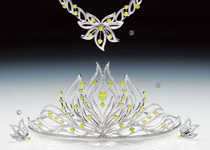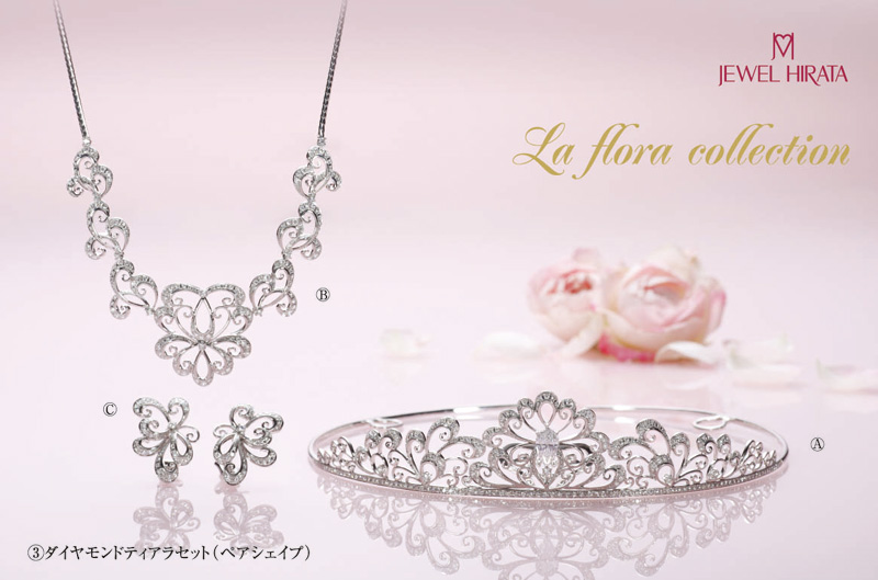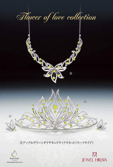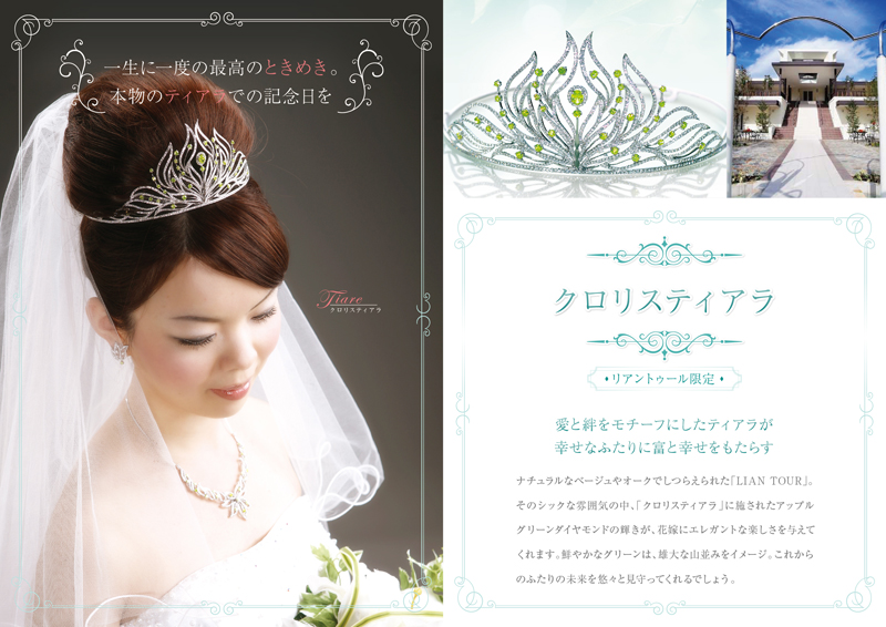 そのシックな雰囲気の中、「クロリスティアラ」に施されたアップルグリーンダイヤモンドの輝きが、花嫁にエレガントな楽しさを与えてくれます。鮮やかなグリーンは、雄大な山並みをイメージ。これからのふたりの未来を見守ってくれるでしょう。リアントゥール